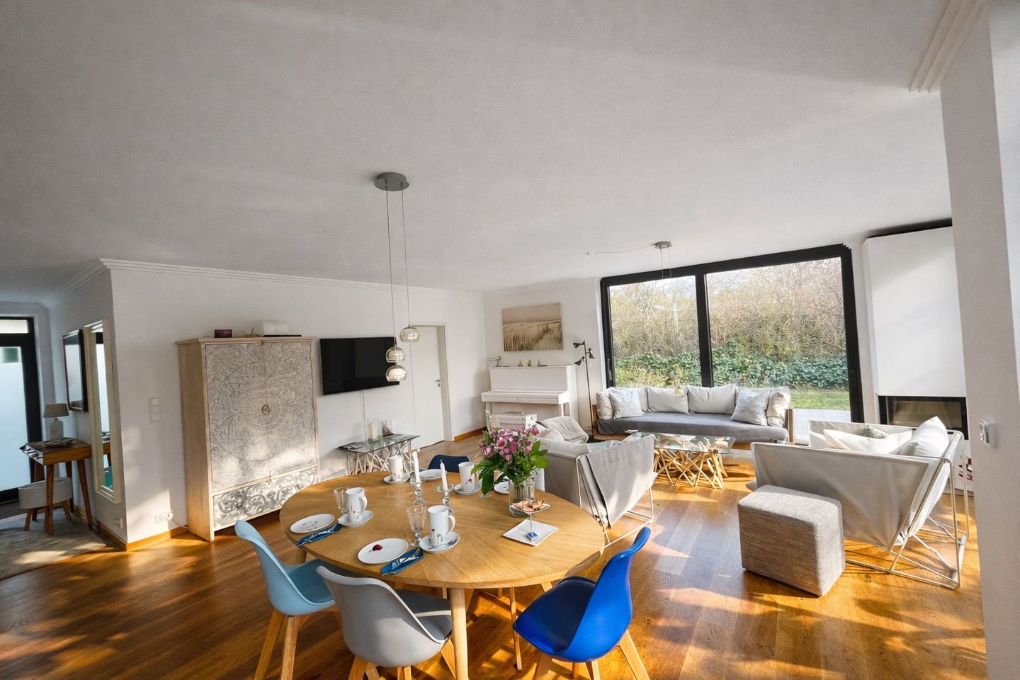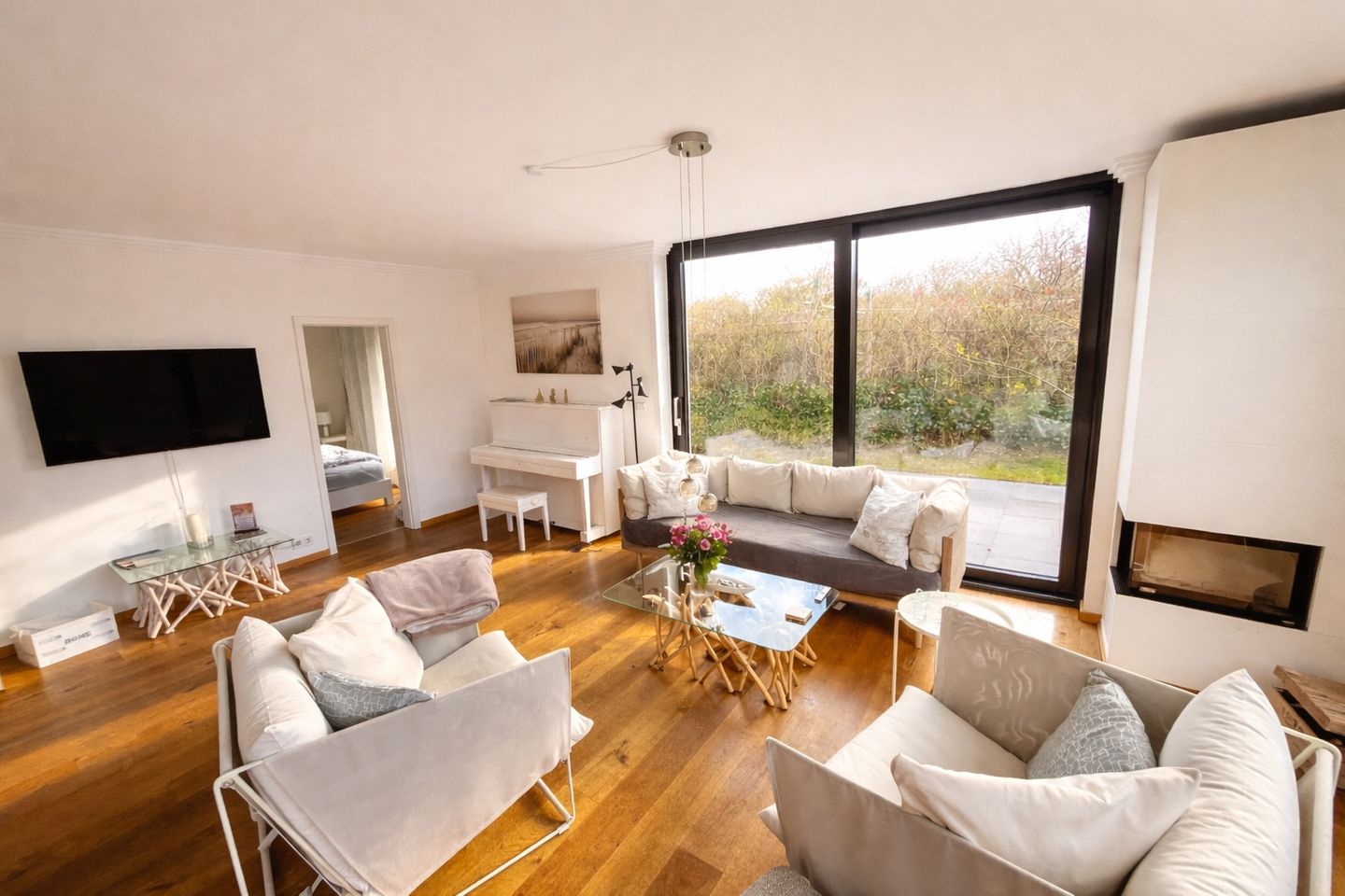 Urlaub heißt für uns nicht nur an einem anderen Ort Zeit zu verbringen, Urlaub ist auch ein Stück Lebensqualität. Deshalb haben wir die Wohnung großzügig und komfortabel gestaltet, moderne Elemente und Klassiker treffen auf Komfort und Behaglichkeit. Bei schönem Wetter kann man auf unserer geräumigen Terrasse in bequemen Korbsesseln ausgedehnt frühstücken. Eile und Hektik im Alltag bleiben zu Haus. Und wenn die Sonne einmal Pause macht, ein Kaminfeuer mit gemütlichen Sesseln und Sofa wartet bereits auf Sie. Schauen Sie den prasselnden Flammen zu, stöbern Sie in unserem Bücherschrank oder aber spielen Sie auf dem Klavier all die Stücke, für die man
